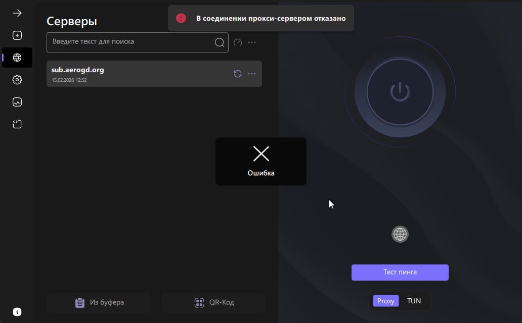 Если вы добавили подписку и локации (страны) появились, но VPN не подключается, включите режим Proxy (переключатель находится под большой кнопкой включения) и попробуйте подключиться снова